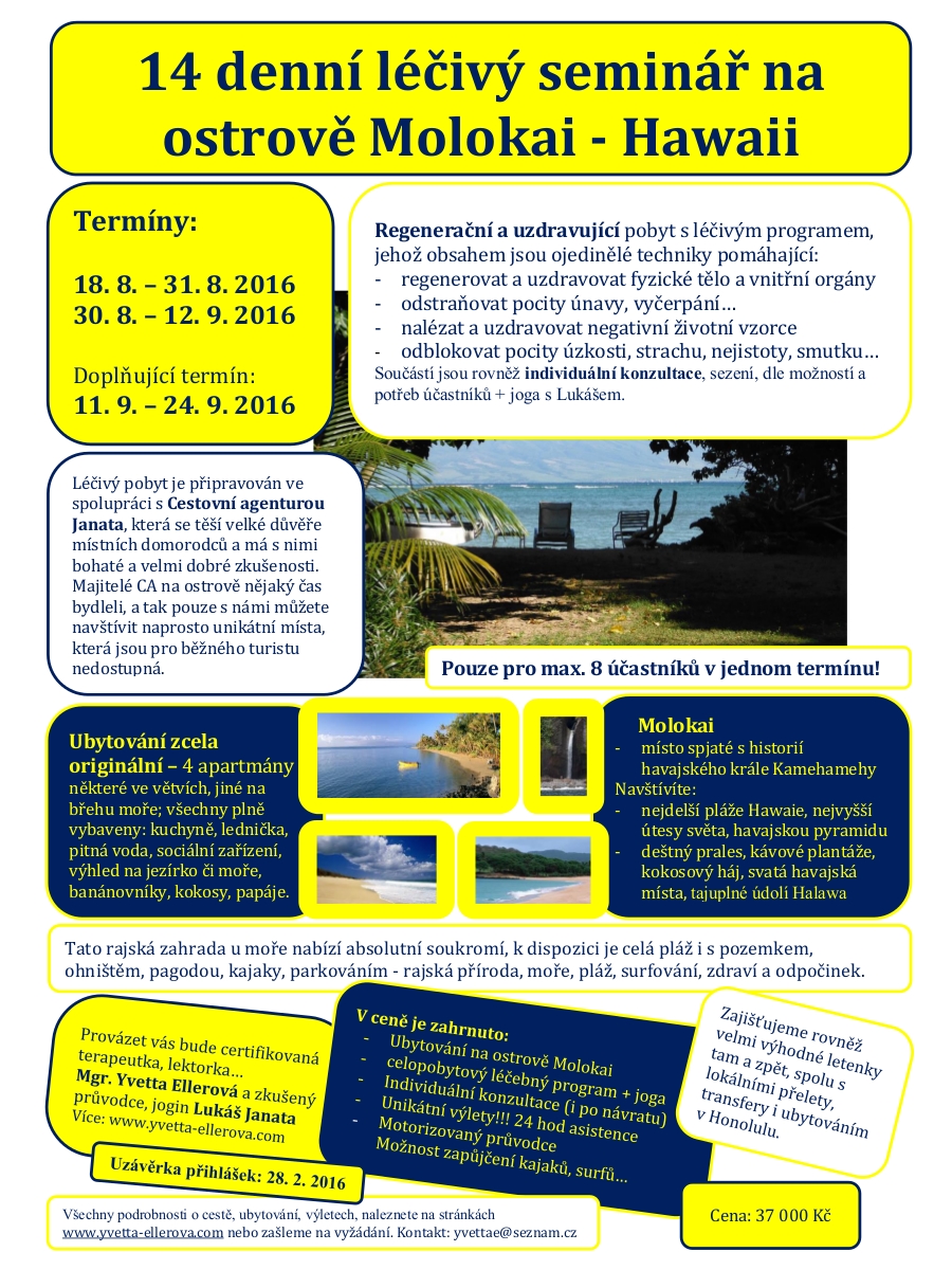 Léčivý seminář na Havaji je daleká cesta k té nejbližší moudrosti, kterou nosí v sobě každý. Ale kdybych vám ji teď třeba jen popsala, nevěřili byste. Kdybych ji s vámi uskutečnila v Ostravě, nebyli byste odpoutáni od stávajících zvyklostí tak, jak je potřeba, a to je základní potřeba. Konečně smysly vnímat rajskou přírodu je nenahraditelné.