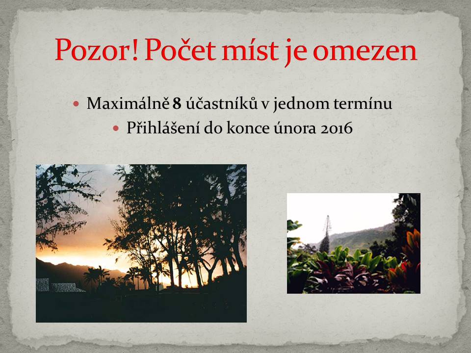 2. Bonus - v ceně 3 000 Kč - při závazném přihlášení do konce února a zaplacení celého pobytu do konce března 2016