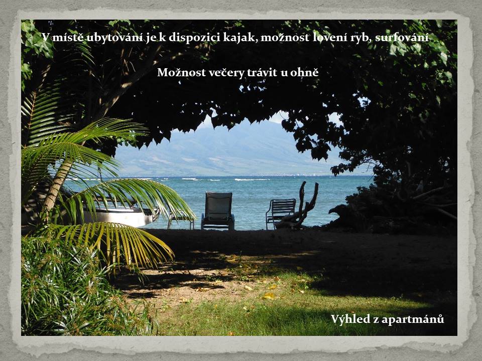 odpoledne společně transfer na letiště a odlet na ostrov Molokai, transfer z letiště, ubytování přímo u pláže v domečcích,