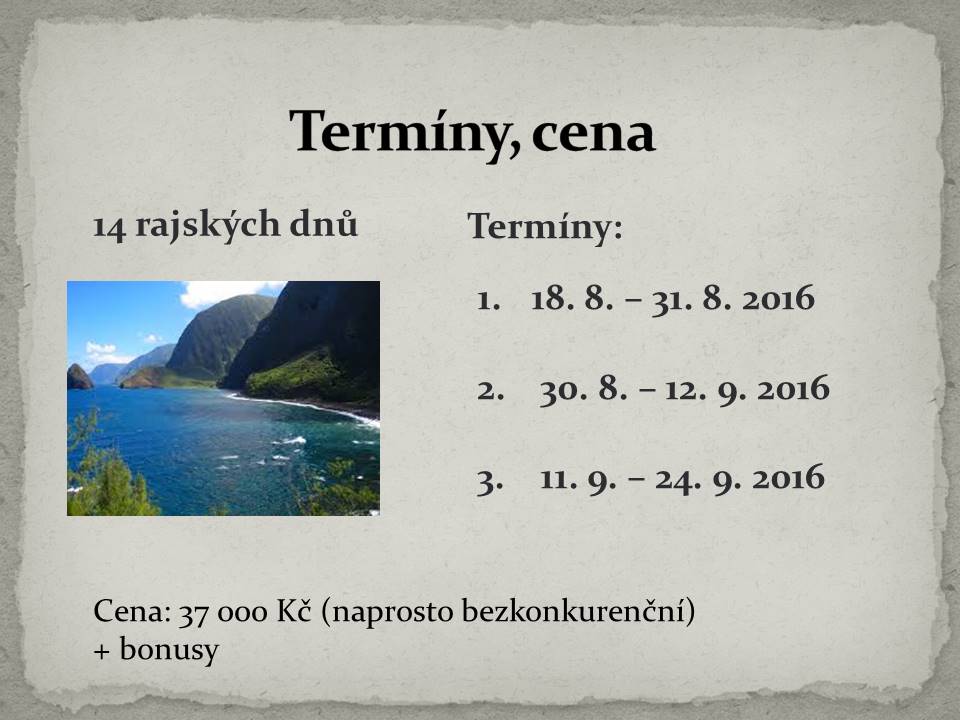 3. Bonus - v ceně 2 500 Kč - při závazném přihlášení do konce února a zaplacení celého pobytu do konce dubna 2016